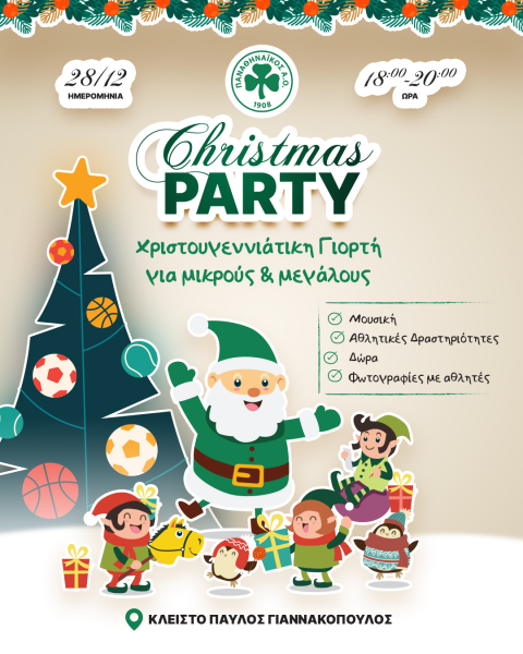 Ο Παναθηναϊκός Αθλητικός Όμιλος γνωστοποιεί ότι την Κυριακή 28 Δεκεμβρίου στις 6μ.μ. θα πραγματοποιήσει μια ξεχωριστή γιορτή για μικρά αλλά και μεγάλα παιδιά στο κλειστό «Π. Γιαννακόπουλος».