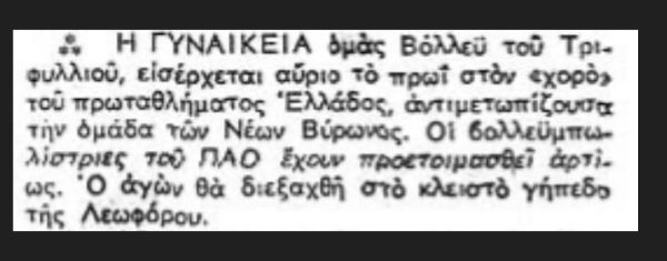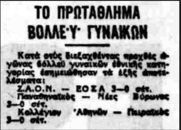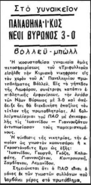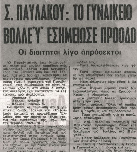 Επιπλέον σε συνέντευξη της βολεϊμπολίστριας Σοφίας Παυλάκου το 1974 (10 Ιουλίου) στην Α.Η. αναφέρεται ότι ο Παναθηναϊκός έχει κατακτήσει πέντε συνεχόμενα πρωταθλήματα.