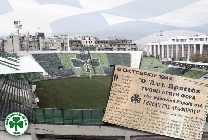 Ο διευθυντής του γηπέδου της Λεωφόρου Αντώνης Βρεττός ύψωσε στον πιο ψηλό ιστό του γηπέδου τη «γαλανόλευκη» και αμέσως οι φυλακισμένοι στα κολαστήρια του Αβέρωφ ξέσπασαν σε φωνές ενθουσιασμούς, ενώ οι Γερμανοί βρίσκονταν ακόμα στην Αθήνα. Για την ακρίβεια ο Βρεττός έδωσε τη σημαία στους ποδοσφαιριστές Διονύση Δεστούνη και Νίκο Σίμο και υπό τους ήχους σαλπιγγών προχώρησαν στην ανέγερση σημαίας.