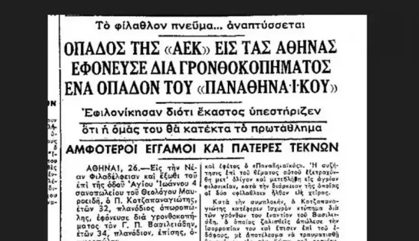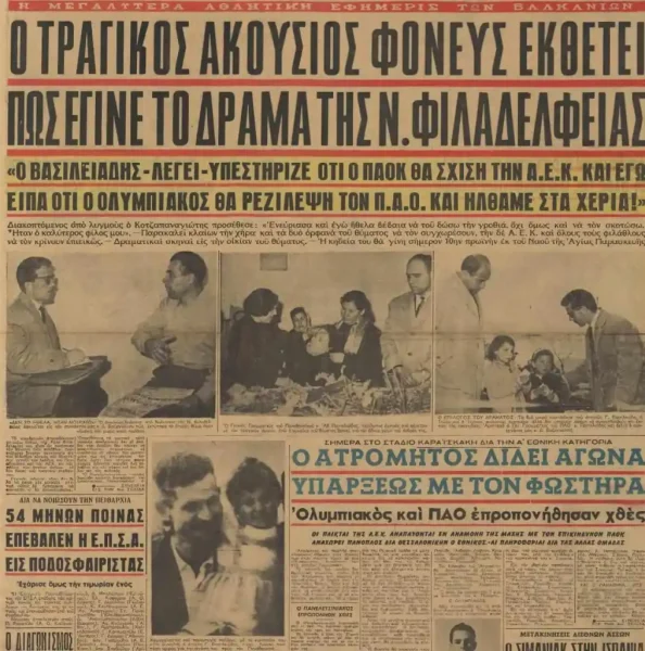 Στις 26 Ιανουαρίου 1961 έπεφτε νεκρός ο 35χρονος «πράσινος» φίλαθλος Γιώργος Βασιλειάδης , πατέρας δύο παιδιών από τον 37χρονο οπαδό της ΑΕΚ Παναγιώτη Κοτζαπαναγιώτη.