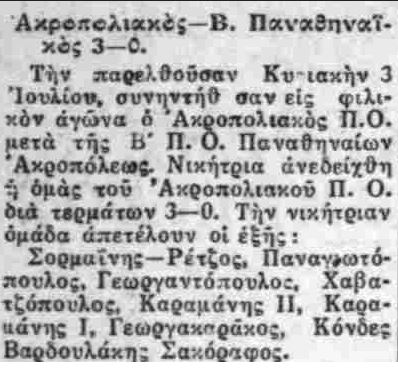 Η συγκεκριμένη παναθηναϊκή αγάπη μεταφράστηκε με τη δημιουργία μίας ομάδας ποδοσφαίρου κατά τη δεκαετία του ’30 που ονομαζόταν «Παναθηναϊκός Ακροπόλεως» ή αλλιώς «Παναθήναια Ακροπόλεως», ενώ έχει καταγραφεί και ως «Παναθηναϊκός Β΄». Μάλιστα, οι νεαροί «πράσινοι» ποδοσφαιριστές έδιναν αρκετά φιλικά ματς με τοπικές ομάδες και έχουν μείνει στην ιστορία οι αγώνες τους κόντρα στον Ακροπολιακό.
