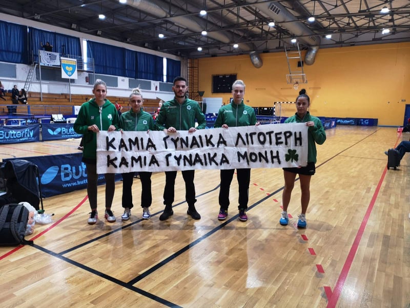 Το γυναικείο τμήμα πινγκ πονγκ του Παναθηναϊκού ξεκίνησε νικηφόρα τις αγωνιστικές του υποχρεώσεις στο πρωτάθλημα κόντρα στην ΑΕΚ στέλνοντας παράλληλα το δικό του μήνυμα στο θέμα των γυναικοκτονιών με πανό.