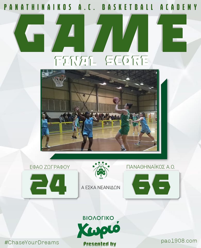 Εννιά στα εννιά για τις Νεάνιδες στο Πρωτάθλημα της Α΄ΕΣΚΑ αφού επικράτησαν και σήμερα το βράδυ στο κλειστό του Γουδή με 66-24 του ΕΦΑΟ ΖΩΓΡΑΦΟΥ