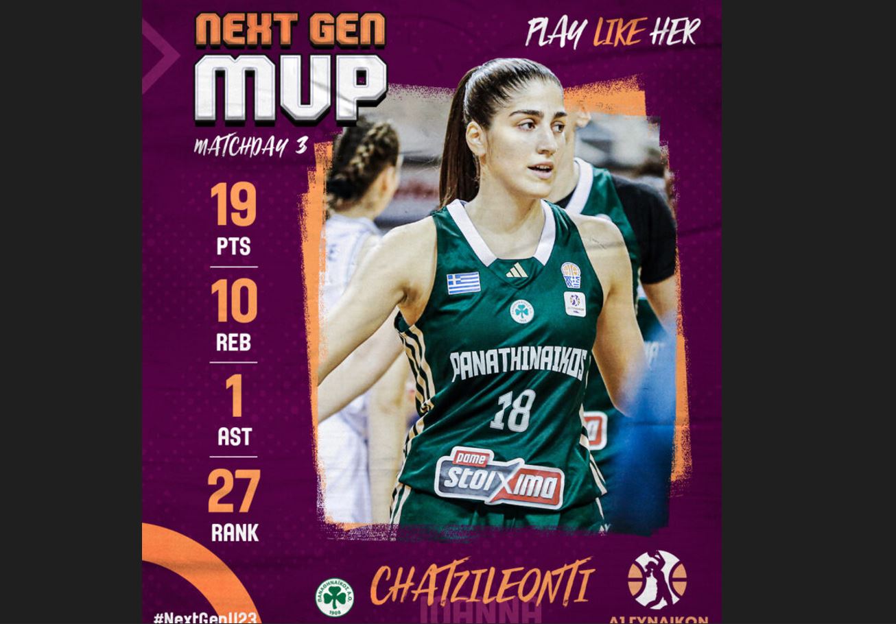 Η Ιωάννα Χατζηλεοντή MVP Next Gen της 3ης Αγωνιστικής στην νίκη του Παναθηναϊκού με 88-82 με αντίπαλο τον ΠΑΟΚ είχε 19 πόντους με 10 ριμπάουντ, μία ασίστ, ένα κλέψιμο και 27 στο σύστημα αξιολόγησης μετά από 32’40’’λεπτά συμμετοχής.