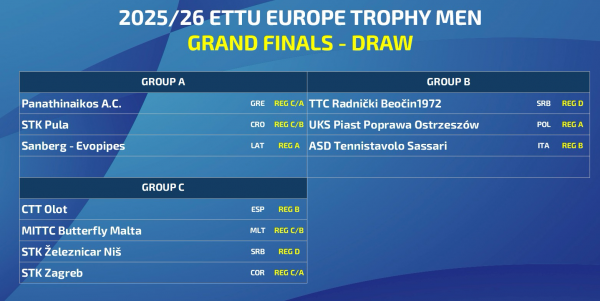 Τις κληρώσεις για το τελικό στάδιο των Europe Trophy της περιόδου 2025-2026 πραγματοποίησε σήμερα 03/03, στην έδρα της στο Λουξεμβούργο, η Ευρωπαϊκή Ένωση Επιτραπέζιας Αντισφαίρισης (ETTU).