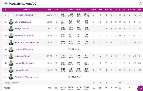Διαιτητές: Ζένις, Μανοΐλοβιτς, Βούκοβιτς Δεκάλεπτα: 26-37, 51-56, 67-80, 100-113 Παναθηναϊκός (Ερντέμ): Φιτζέραλντ 44 (2), Κοτούλα, Μπράουν 13 (1), Κουμαντσιώτου, Γαλανόπουλος 10, Βίτολα 7, Χατζηλεοντή 13, Κριμίλη 13 (1)