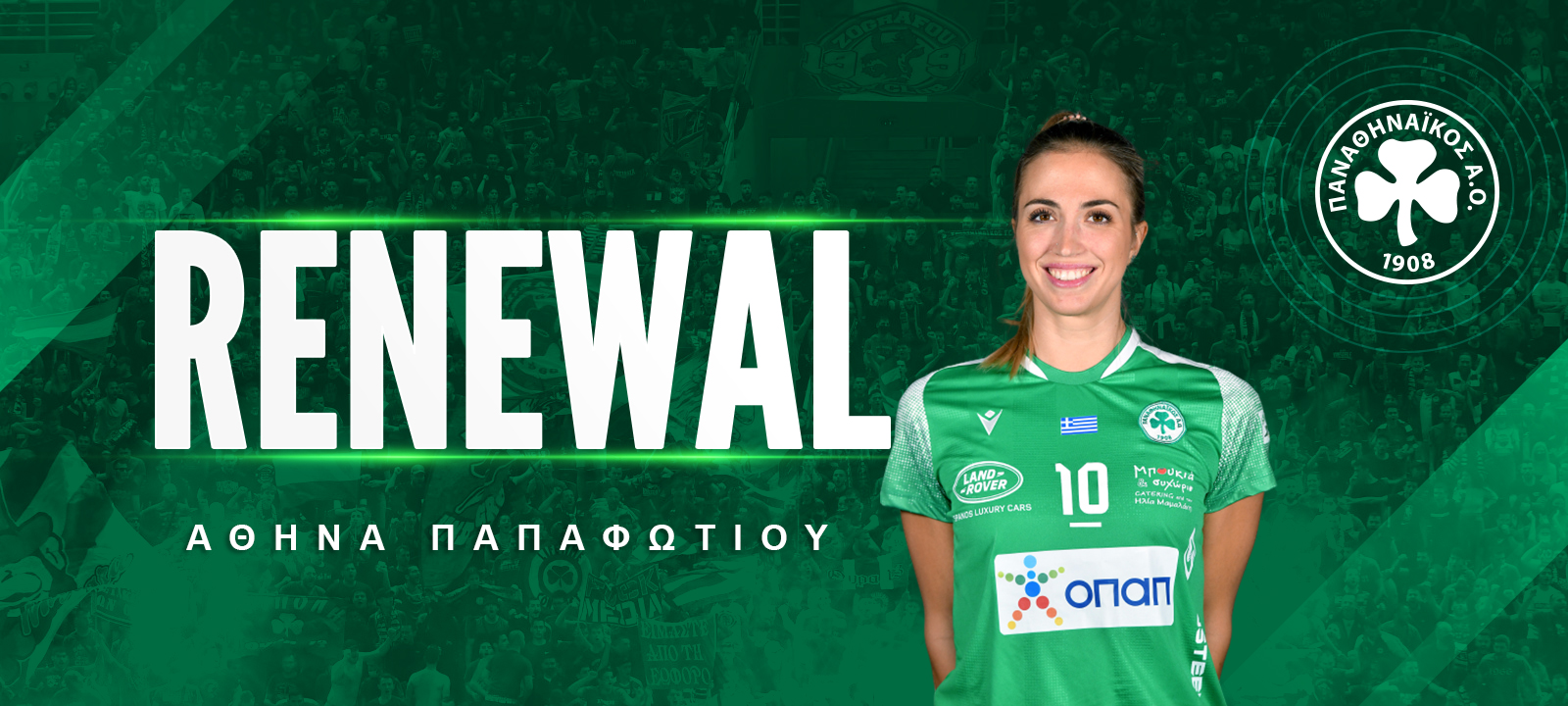 Ο Παναθηναϊκός Αθλητικός Όμιλος ανακοινώνει την ανανέωση της συνεργασίας του με την Αθηνά Παπαφωτίου για το γυναικείο τμήμα βόλεϊ, την αγωνιστική σεζόν 2023-2024.