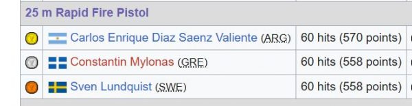 Στην περίπτωση του Κωνσταντίνου Μυλωνά, τα αποτελέσματα αναφέρουν ότι είχε 60 hits και 558 points. Ο αθλητής που κέρδισε το χρυσό μετάλλιο, Carlos Enrique Diaz Saenz Valiente (Αργεντινή), είχε επίσης 60 hits, αλλά 570 points, δηλαδή οι βολές του ήταν πιο κοντά στο κέντρο του στόχου, κάτι που του έδωσε υψηλότερο συνολικό σκορ.