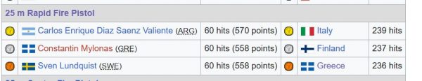 Κατά συνέπεια τα 60 hits του Μυλωνά ήταν ισοφάριση Παγκοσμίου ρεκόρ και σε αυτή τη διοργάνωση το πέτυχαν σίγουρα άλλοι 4 σκοπευτές από Αργεντινή (Βαελιέντε), Σουηδία (Λούντκουιστ), Ιταλία και Φινλανδία.